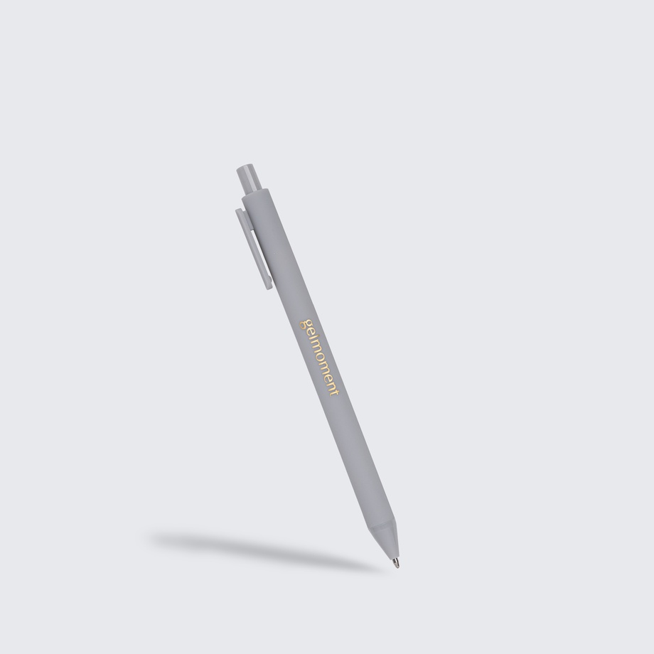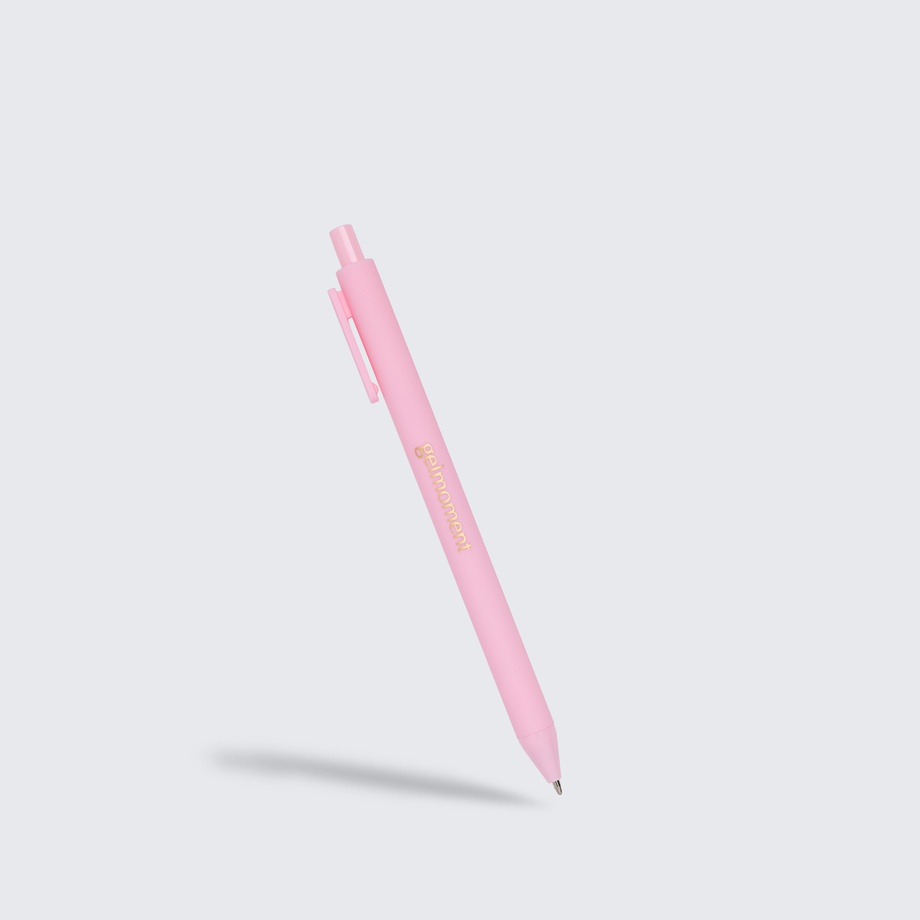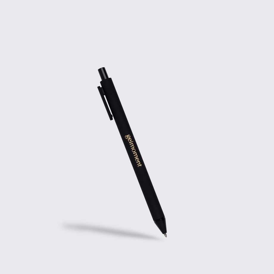 Pack of 4 pens in assorted colours. All monochrome, branded in gold with the Gelmoment logo. Black ink.